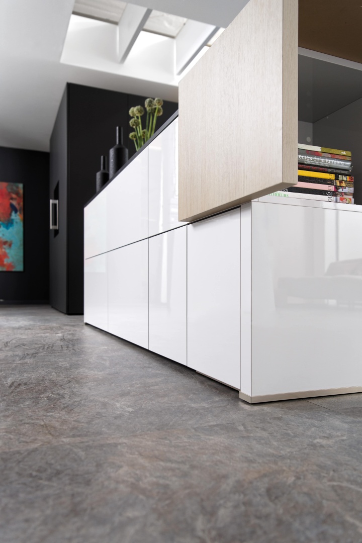 Skromná kuchyně se zajímavě řešeným barovým pultem. Krásně elegantní v jednoduchých barvách.